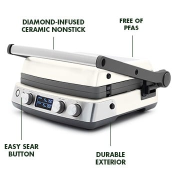 This feature-packed grill/griddle acts like a full kitchen: reversible plates for griddle or press, independent temps for top and bottom, and instant sear for perfect finishes—all with a simple, intuitive control panel.