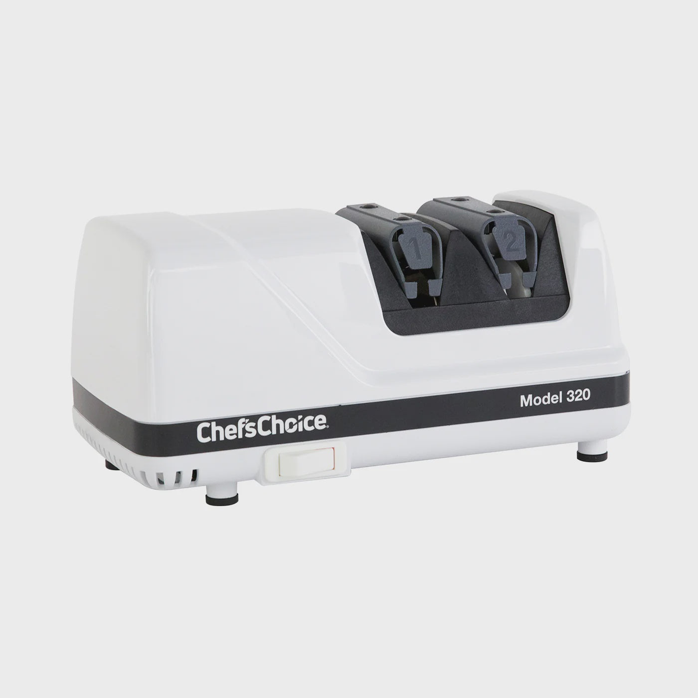 Keep your knives sharp and cutting like new with the Chef'sChoice Professional Electric Knife Sharpener with Diamond Hone. Compact and lightning fast, this professional sharpener uses advanced technology to sharpen both fine edge (straight edge) and serrated knives. The 2-stage sharpening provides arch-shaped edges, which are stronger and longer lasting than hollow ground or conventional “V” edges. Stage 1 uses 100% fine diamond abrasives to create the first bevel and Stage 2 ultra-hones the edge using advanced micron size 100% diamond abrasives to complete the second bevel. The precisely formed conical diamond abrasive disks gently apply optimal sharpening pressure, guaranteed to never detemper the edge. Highly-precise knife guides automatically position and stabilize the knife as you sharpen for fast, foolproof results. The Model 320 is ideal for sharpening all types of knives, including kitchen, household, sporting and pocket knives. This compact unit features resilient elastomeric feet that hold the unit securely to the work surface. Engineered and assembled in the USA. Covered by the Chef'sChoice Three-Year Limited Warranty.