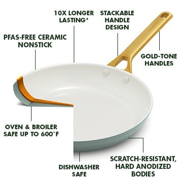 A powerful blend of design and innovation, Reserve Pro delivers exceptional durability, stackable convenience, and oven-ready strength. Engineered for every day, this 8" frypan features our most advanced ceramic nonstick for effortless, PFAS-free cooking. Finished with a gold-tone handle, it's the perfect size for solo meals, quick breakfasts, or delicious sides.