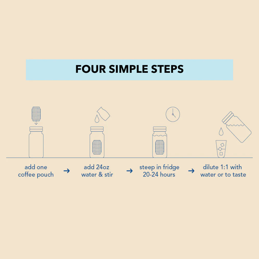 Making cold brew at home just got a lot easier! Each single-use pouch contains 3oz of pre-ground coffee specifically for cold brew. One pouch fits perfectly in your favorite brewing vessel to create a delicious cold brew overnight in your fridge.