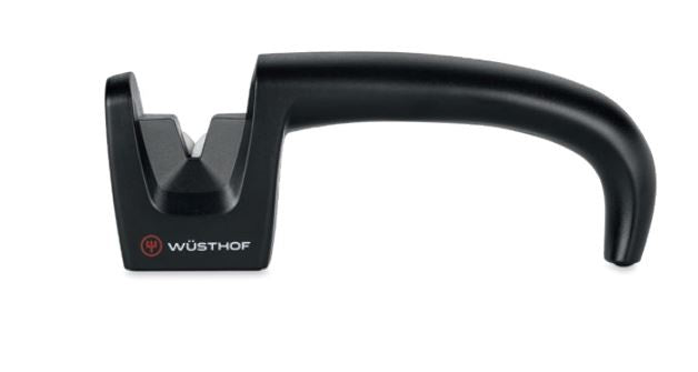 The easiest way to keep knives sharper for longer. Two rotating ceramic discs are mounted at precisely the right angle inside this knife sharpener to ensure fast, sharp results. Equipped with a hand guard and non-slip rubber feet, the knife sharpener also protects against injury or slipping. In contrast to the 2-stage Knife Sharpener, this Sharpener is for fine sharpening only (for knives that are already moderately sharp or that have already been coarsely sharpened.