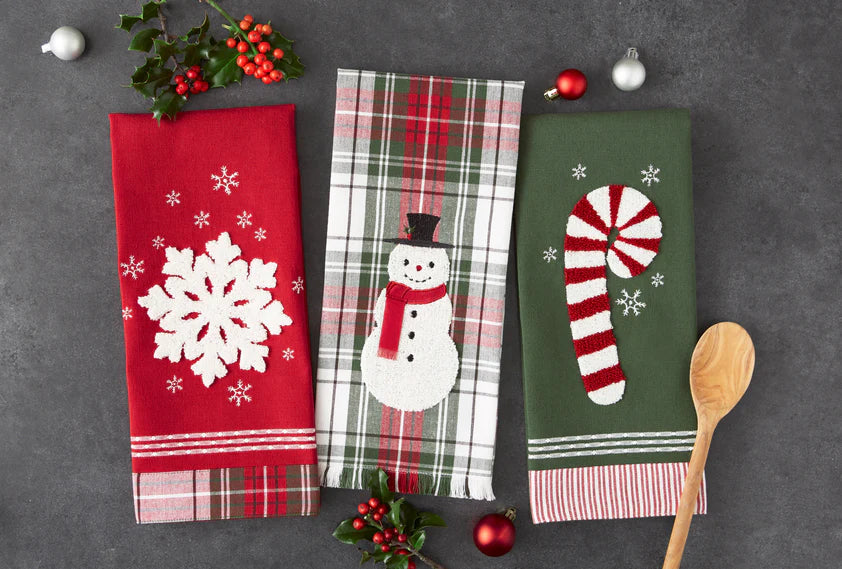Dishtowel is embellished with a flocked embroidery candy cane and bottom hem is finished with 1.5-inch candy cane stripe applique piecing