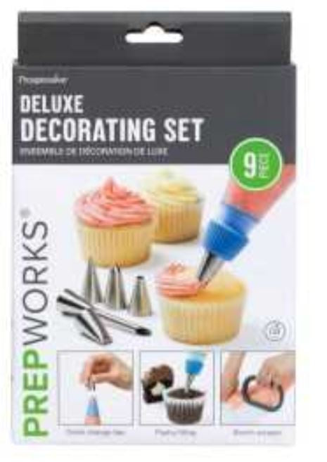 9-piece set includes reusable piping bag, tip coupler, 6 stainless steel tips, and a bag-filling aid/bench scraper