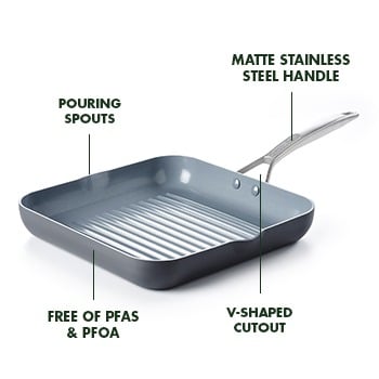 Made from hard anodized aluminum, this 11” grill pan is fully equipped with grill ridges, pouring spouts, and matte stainless handles. This clever pan is just the ticket for seared steaks, breakfast favorites, and tender veggies.