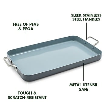 This versatile griddle spans across two burners for ample cooking space to whip up breakfast feasts, sizzling lunches, or gourmet dinners. Finished in our signature ceramic nonstick, this griddle heats quickly, evenly, and wipes clean when you’re through.