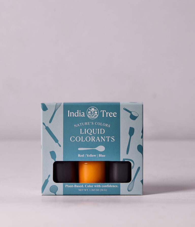 Natural liquid food coloring set (red, yellow, blue) with plant-based colorants (vegetable juice, spirulina, turmeric, beta-carotene) – dye-free and water-soluble – for bakery & confectionery use.