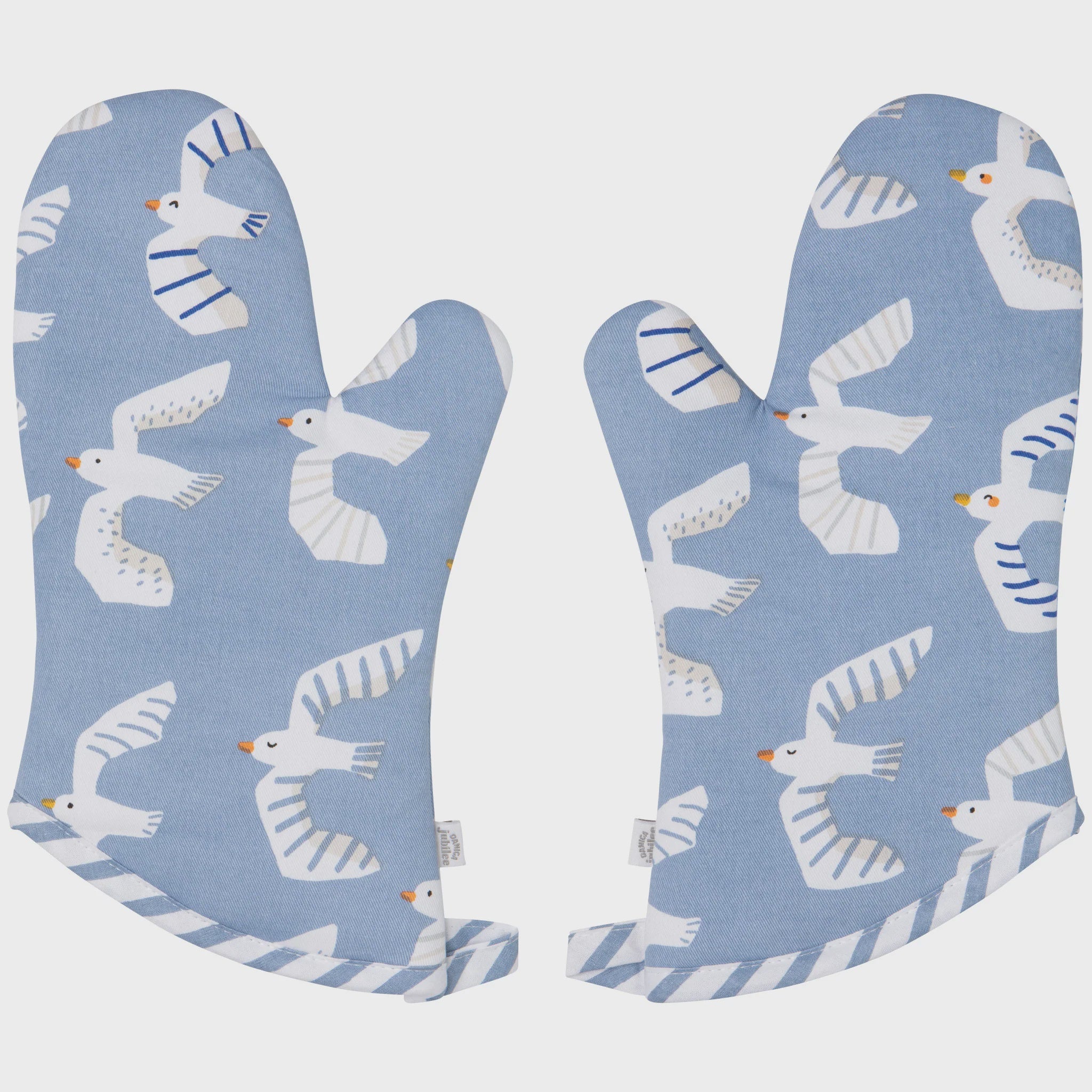 Every kitchen needs a great pair of Birdie oven mitts. Made from 100% cotton and lined with silver acrylic coated cotton, each mitt is 13-inches long and measures 6.5-inches from thumb to exterior side. The quilted construction with insulation also helps to protect your hands from the heat. Easy breezy seaside charm swoops in with our Birdie collection. High-spirited, hand-drawn birds and a mineral blue capture the joy of flight and fresh air.