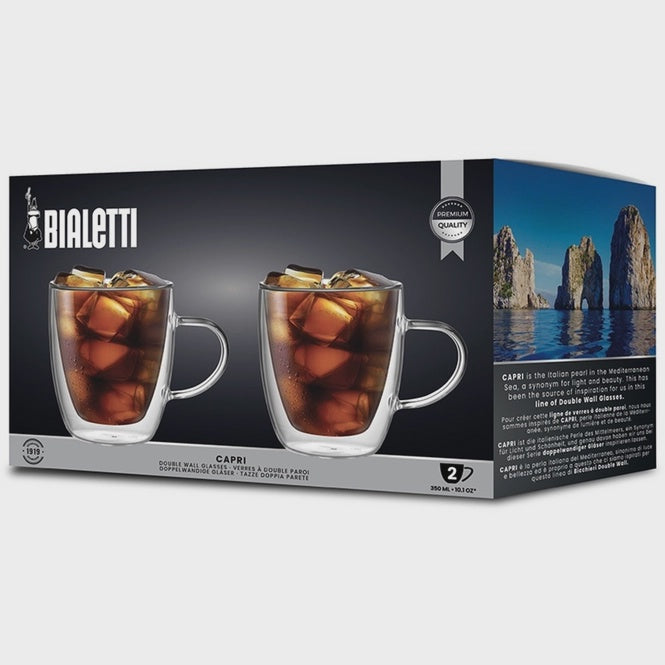 This elegant glass (set of 2) from Bialetti's Capri series is the perfect addition to your coffee or tea experience. With a capacity of 350 ml, you can enjoy a delicious large portion of your favorite beverage. The double-walled design ensures that your latte macchiato stays at the perfect temperature for longer, allowing you to savor every sip. Made from high-quality borosilicate glass, this glass is dishwasher safe and easy to clean. With its transparent color and Italian flair, this glass is a true pearl of the Mediterranean Sea. Add a touch of luxury to your coffee moments with this beautiful glass from Bialetti.