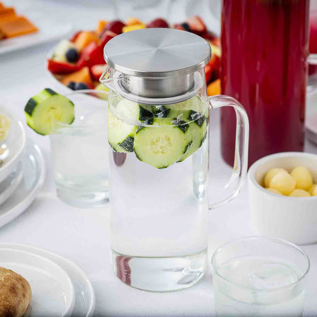Add a touch of sophistication to any table with this beautifully designed 34 oz glass carafe. Crafted from heat-resistant borosilicate glass, it's ideal for both hot and cold beverages. The sleek stainless steel lid features a built-in strainer for ice or infused drinks, along with a free-pour opening perfect for thicker liquids like salad dressings. A secure silicone seal keeps the lid firmly in place, ensuring mess-free pouring. Functional and stylish, this carafe is a refined addition to any kitchen or dining setting.