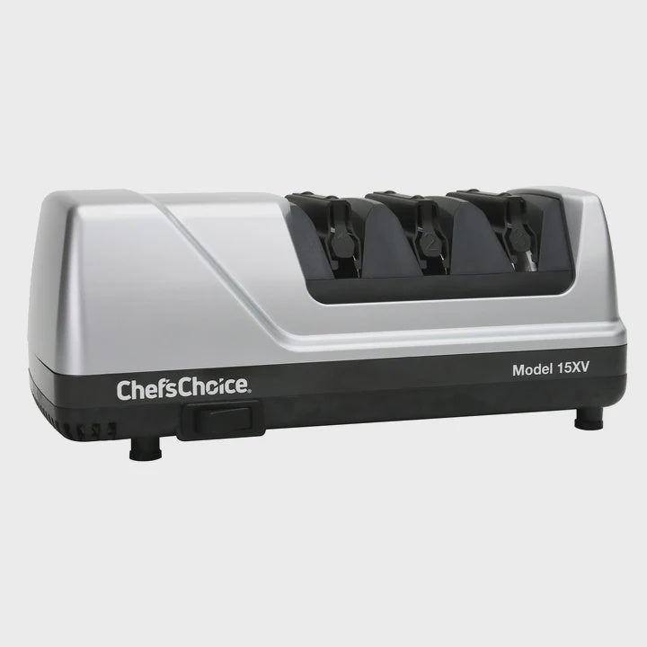 The 15XV professional 3-stage electric knife sharpener is the ideal solution for improved cutting performance on 15-degree class knives. Using 100 percent diamonds, the hardest natural substance on earth, our patented abrasives sharpen faster and easier to create an ultra-sharp, longer-lasting edge. In the final stage, patented stropping disks create an unparalleled polished finish. Precision angle guides ensure accurate sharpening throughout the entire blade length and eliminate any guesswork. In addition, this sharpener can easily convert a traditional 20-degree knife edge to a more precise 15-degree edge. This unit is designed to work with both straight-edge and serrated knives.