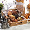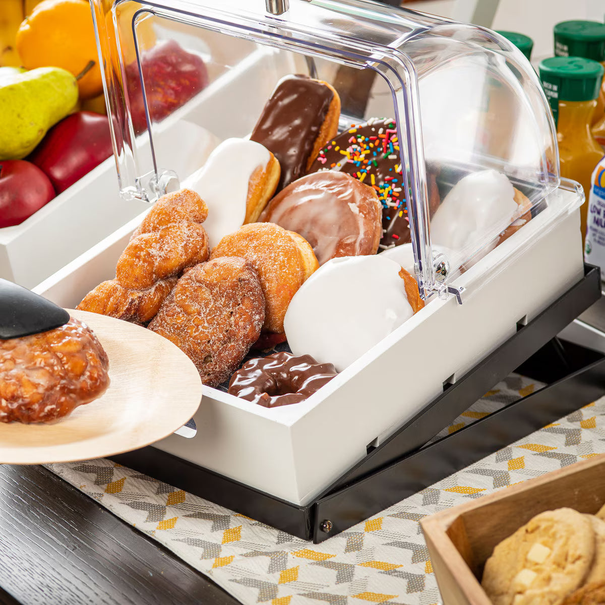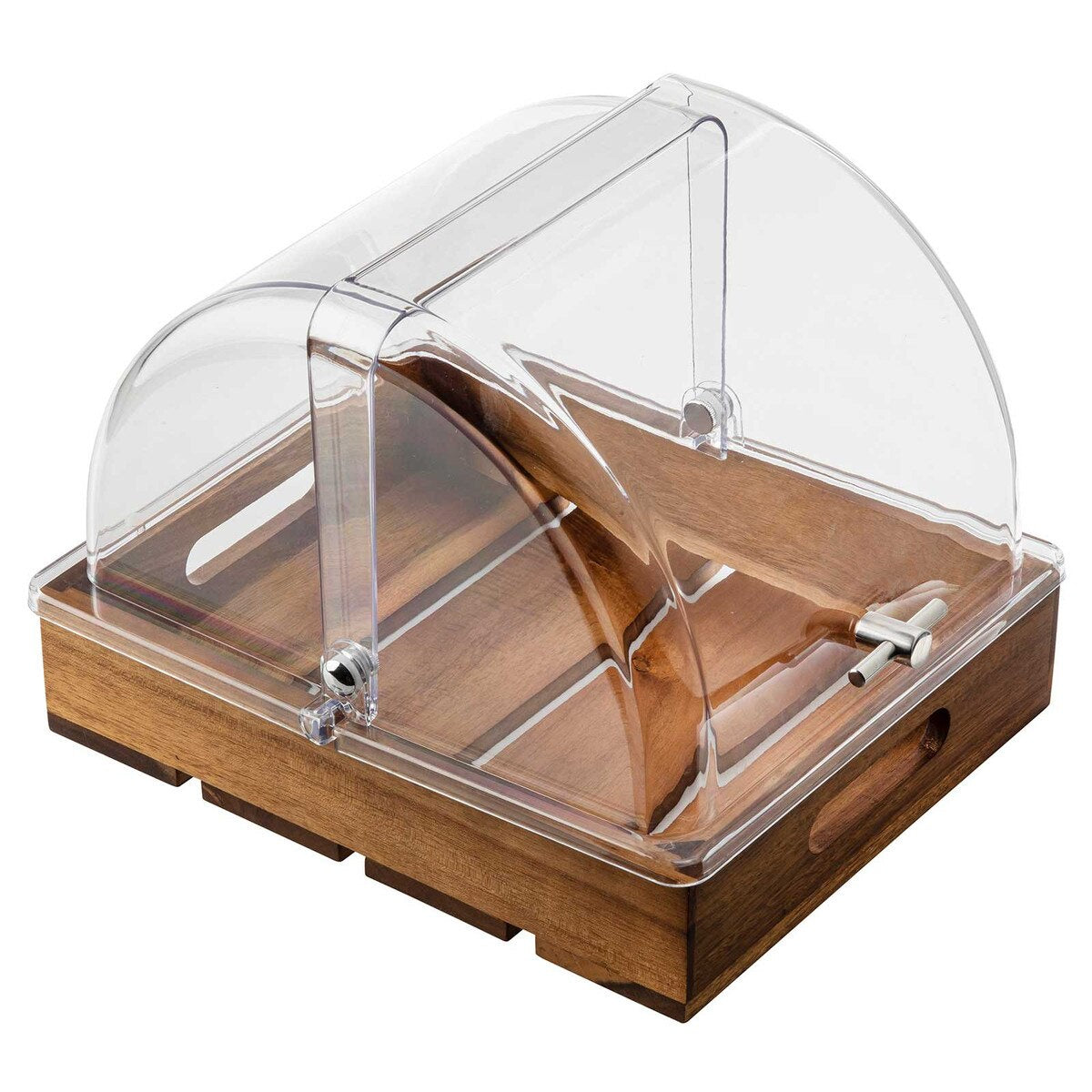 Use this rectangular roll top lid to display and protect your muffins, danishes, breads and various hors d'oeuvres. This lid is designed for use with half-size trays or food pans (sold separately) and offers crystal clear clarity for excellent content visibility. Made out of durable polycarbonate, this cover's construction ensures longevity with high-volume use in your buffet, bakery, or catered event. In addition, a metal handle on the front allows both customers and employees easy access to products. Optimize the taste, texture, and quality of your culinary creations by covering them with this roll top lid!