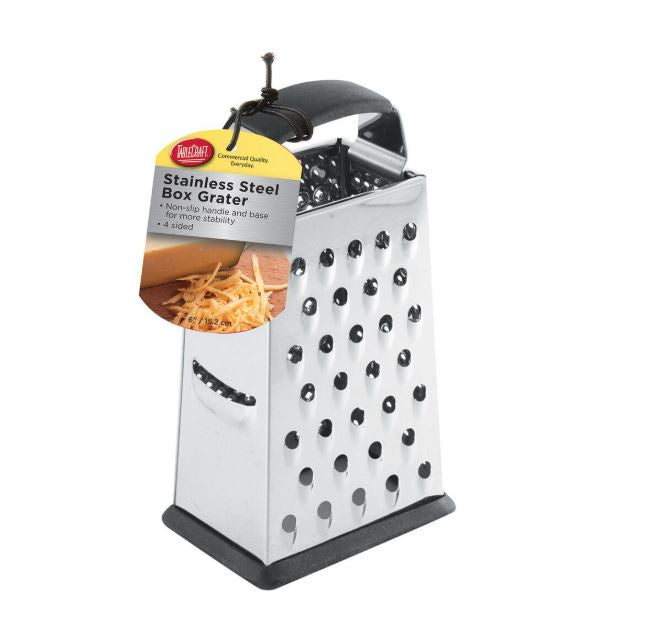 Tackle a variety of prep tasks with our compact 4-sided tapered grater, designed for versatility and efficiency in professional kitchens. Each side offers a different function -- fine grating, medium grating, zesting, and slicing -- making it the perfect all-in-one tool for cheese, vegetables, citrus, and more. A sturdy top handle provides a secure grip for stability during use, while the durable stainless steel construction withstands heavy-duty, daily foodservice demands and the rubber bottom keeps it in place. Compact and efficient, this grater is an essential tool for restaurants, catering, and high-volume kitchens.