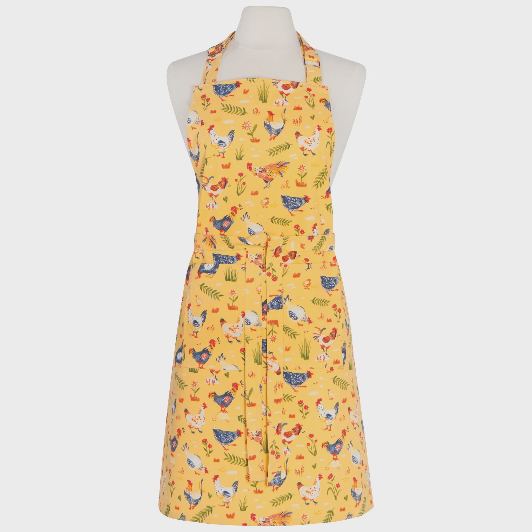 Feathered friends rule the roost in the cozy farmyard scenes of the Free Range Chef apron. Its many features include an easily adjustable neck strap, extra long waist ties, bar-tacked stress points for extra durability, and a strong pocket to hold all your tools. With plenty of attention to detail, the warm greens and yellows and country-kitchen creams and blues of this design are inspiring ingredients for farm-fresh cooking and baking.