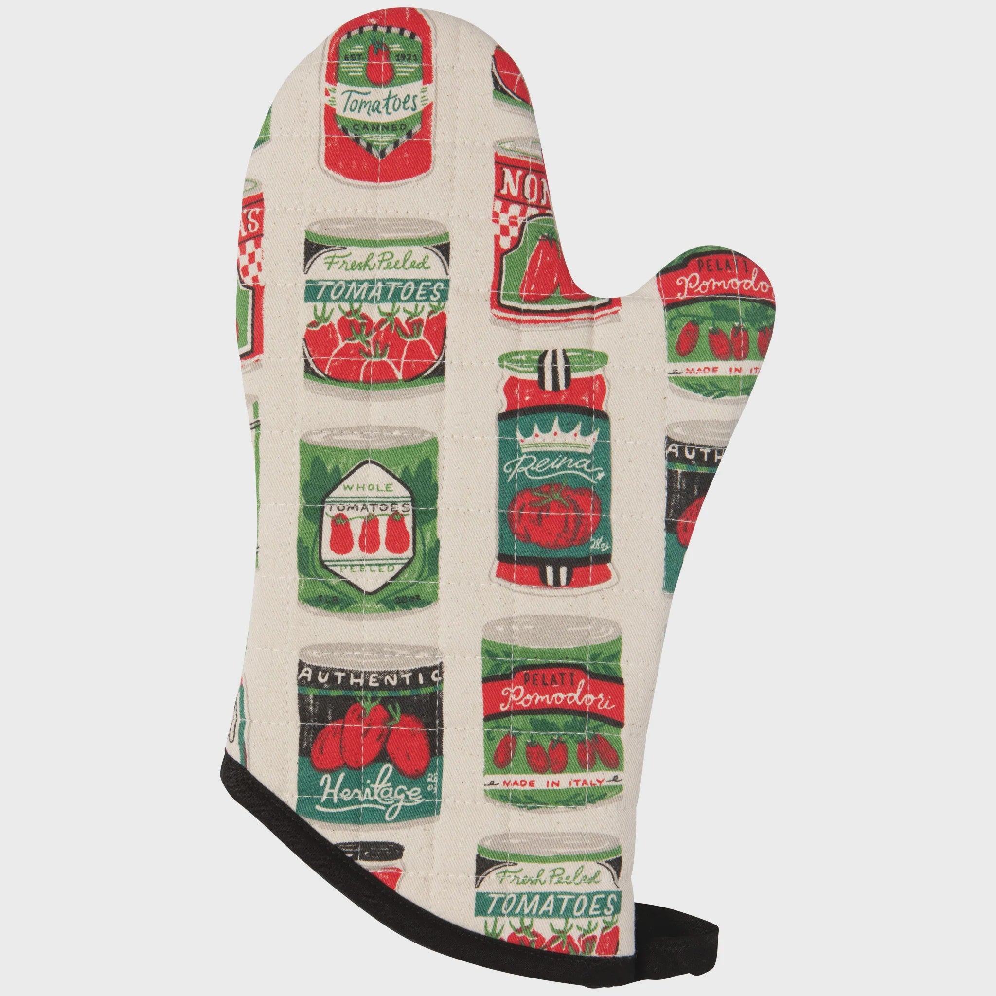 Every kitchen needs a Pomodori chef oven mitt. Made from 100% cotton and lined with silver acrylic coated cotton, this mitt is 13-inches long and measures 6.5-inches from thumb to exterior side. The quilted construction with insulation also helps to protect your hand from the heat. Inspired by vintage market stalls and timeless culinary craft, Pomodori pairs hand-drawn detail with playful lettering and classic red-and-green patterns. Juicy tomatoes, rustic labels, and lush vines evoke a sense of gourmet nostalgia—straight from nonna's kitchen.