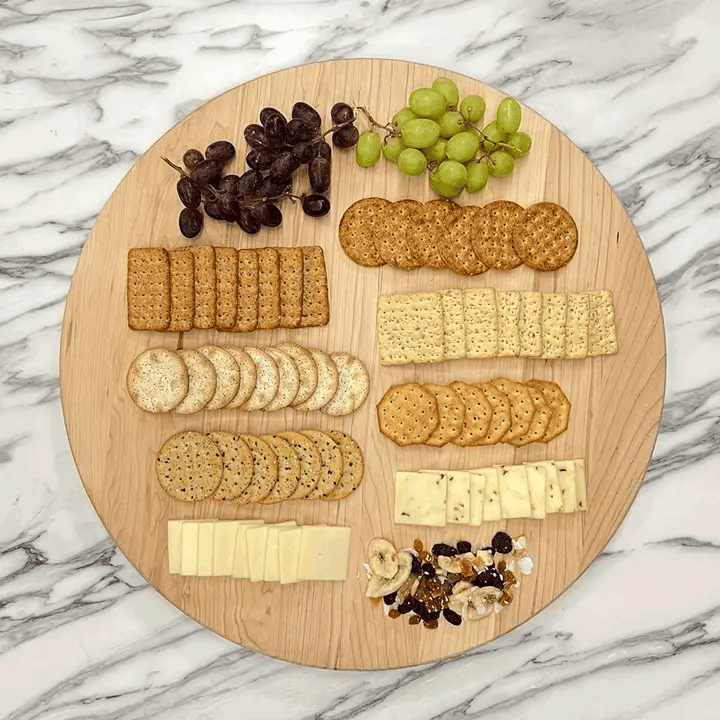 The Maple Lazy Susan is oversized at 22" in diameter. This provides a lot of space to build an amazing charcuterie board that guests can spin to their favorite nibble. The large size works well on a large kitchen island countertop.