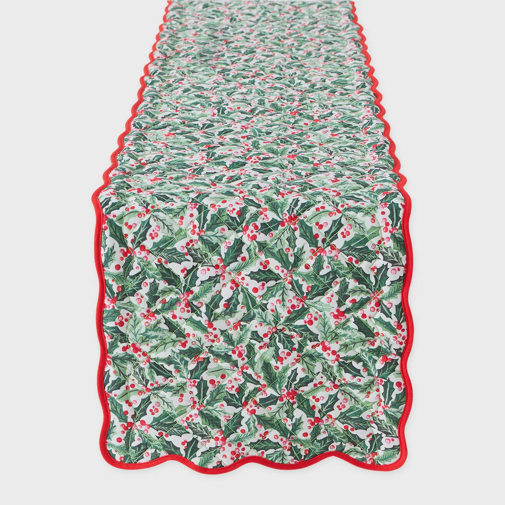 Bring holiday cheer to your table with the Design Imports Holly Jolly Quilted Table Runner. Featuring a playful classic holly print and a festive red scallop trim, this quilted runner adds warmth and charm to your seasonal décor. The soft cotton construction and stitched detailing offer both durability and a cozy, textured feel. Whether you're hosting a holiday feast or simply want to make your everyday dining more merry, this runner makes a cheerful statement while protecting your table from spills and scratches.