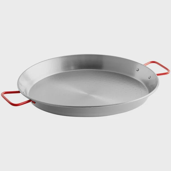 The perfect size for cooking and serving a traditional paella, this pan is made of light weight and durable carbon steel which is a great conductor of heat. The shallow, wide shape of this pan creates a large cooking surface that lets liquid evaporate quickly for optimal development of the socarrat. Socarrat, the crispy, caramelized base of the paella, is toasted on the bottom of the pan. Dimples on the pan's cooking surface create irregularities allowing heat to spread more evenly across the surface.