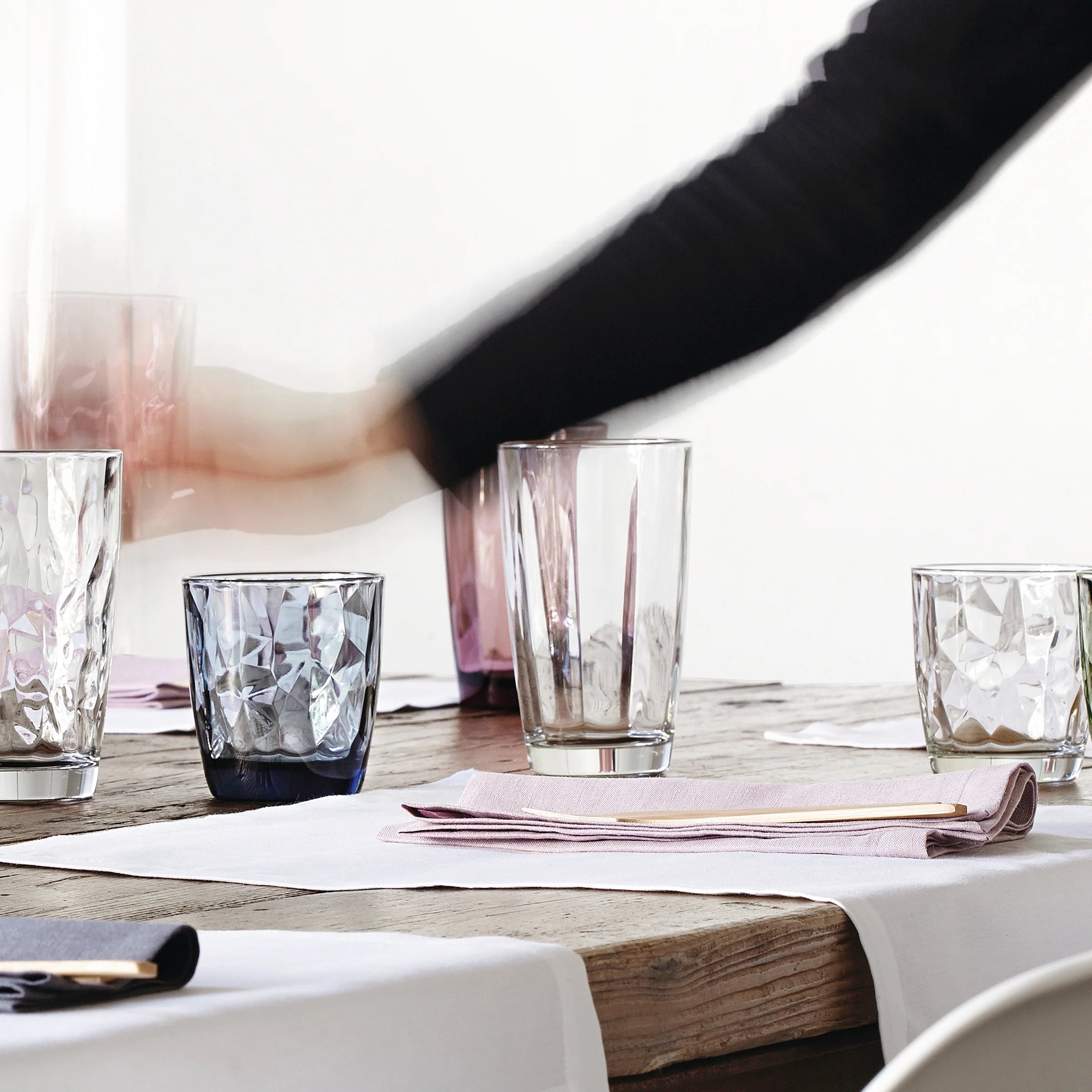 This glass is part of the Pulsar collection: featuring a handmade look with a feel of genuine artistry, Pulsar is the perfect answer for a special and elegant set. The cooler glass is ideal for serving cocktails, drinks and long drinks that require the use of crushed ice. Like all the glasses in the collection, it is delicately faceted; the light effects are amplified by the delicate and iridescent shades of color.