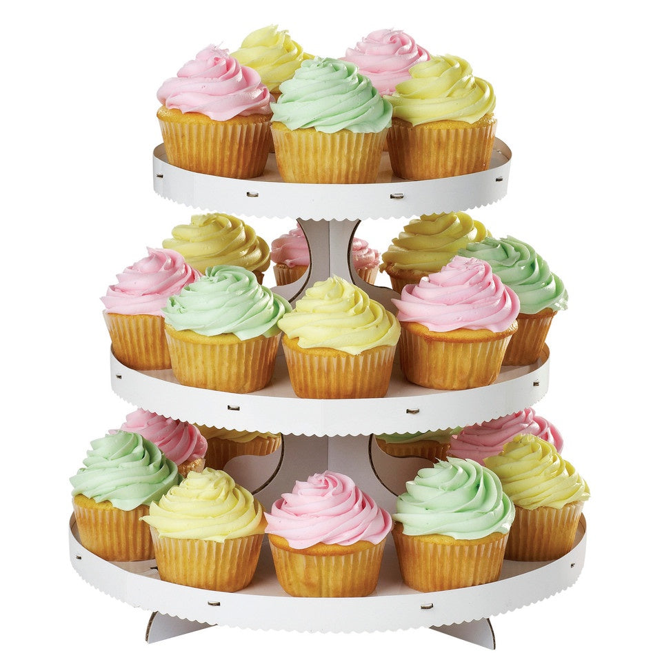 This three-tiered white cupcake stand is designed to showcase up to 24 standard cupcakes with elegant simplicity. Crafted from sturdy cardboard, it features interlocking legs that support small, medium, and large plates for easy assembly and stable presentation. Ideal for professional events or bakeries, it combines functionality with a clean, classic look.