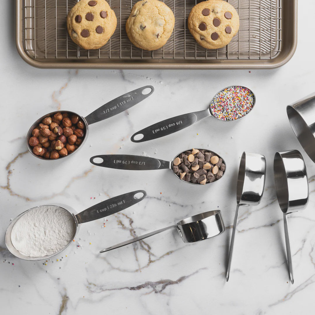 See why our measuring cups are highly rated - as they are made to measure! Their unique oval shape allows for easy scooping, and fitting into narrow jars. You can feel the durability! Made from high quality stainless steel. They fit together neatly and are held together with a simple storage clip.