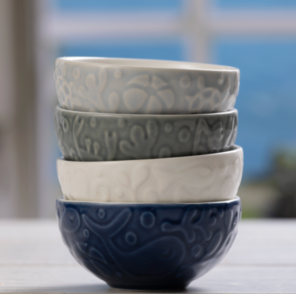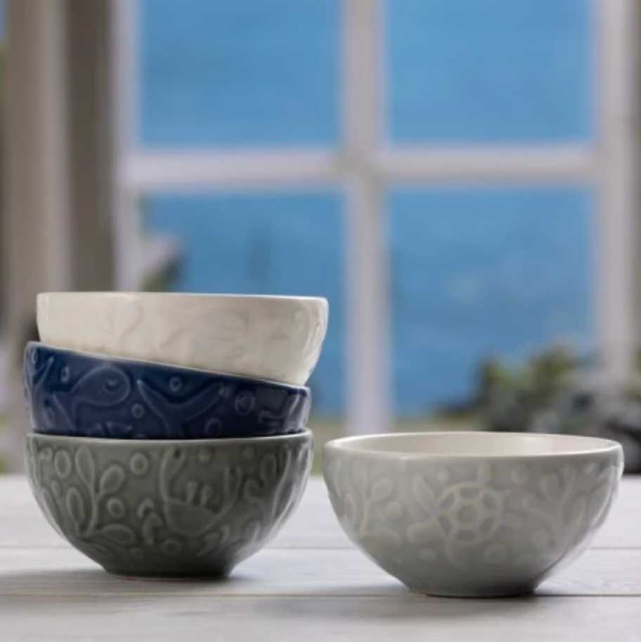 The Mason Cash Nautical range is intricately embossed with sea, lake & river creatures. The preparation bowls are made from chip resistant stoneware. The bowls store ingredients when preparing food and can be used as pinch pots, dip dishes and dessert dishes. Each bowl measure height 5cm x diameter 10cm and has a capacity of 175ml, and are dishwasher and microwave safe. The dishes are in beautiful tones of blues, grey and cream. Mason Cash was established in the heart of the English ceramic industry back in 1800 and has become world renowned for its innovative, classic kitchenware today.