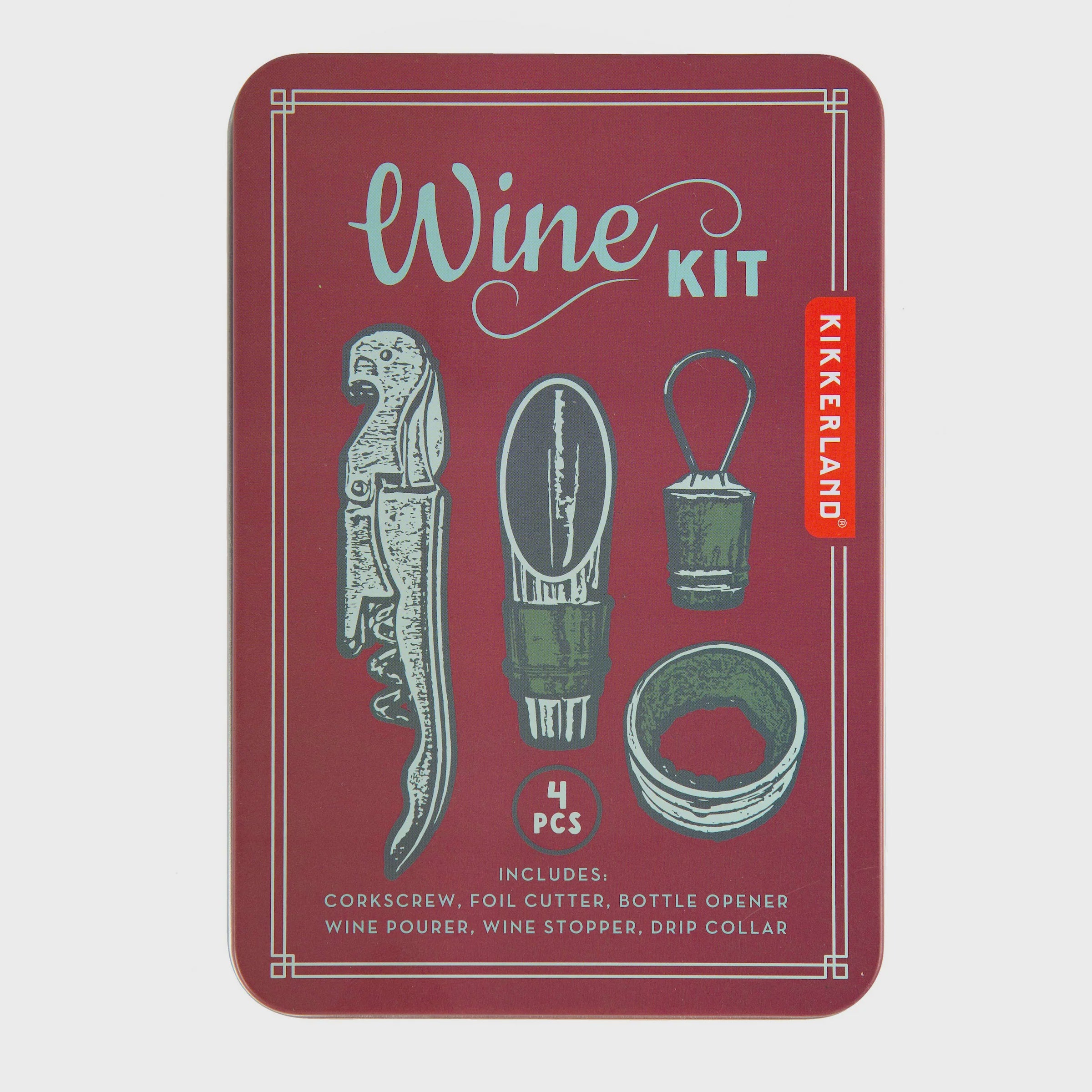 A complete set of wine tools in a sleek tin: corkscrew, pourer, stopper, and drip ring.